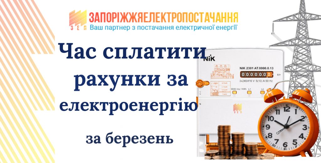 ТОВ «Запоріжжяелектропостачання» інформує, що рахунки за спожиту електричну енергію у березні 2026 року направлені до банків та фінансових установ.